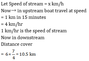 Q1. A boat which has a speed of 5 km/hr in still water cover 1km upstream path in 15 minutes. How much distance it could cover in 1 hour 45 minutes in downstream: