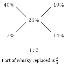 Q2. A jar full of whisky contains 40% alcohol. A part of this whisky is replaced by another containing 19% alcohol and now the percentage of alcohol was found to be 26%. The part of whisky replaced is: