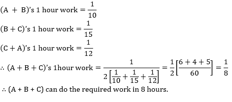 Q10. Three pipes A, B and C are connected to a tank. A and B together can fill the tank in 10 hours, B and C together in 15 hours and C and A together in 12 hrs. In how much time will pipe fill the tank together (in hours)?