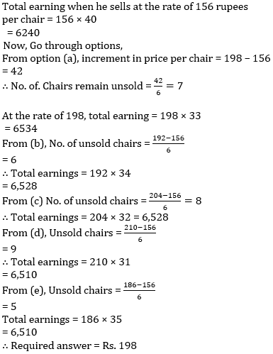 Q4. Uday wants to sell 40 chairs. If he sells them at Rs. 156 per chair, he would be able to sell all the chairs. But for every Rs. 6 increment in price, he will be left with one additional unsold chair. At what selling price would he be able to maximize his profits (assuming unsold chairs remain with him)?