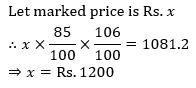 Q9. A discount of 15% is given on the marked price of an article. The shopkeeper charges sales tax of 6% on the discounted price. If the selling price be Rs 1081.20, what is the marked price of the article?