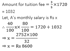 Q15. A gave 40% of his monthly salary to B. B spent 20% of this amount on taxi fare. He spent the remaining amount in the respective ratio of 3 : 5 on tuition fees and library membership. If he spent Rs 1720 for membership, what is A’s monthly salary?