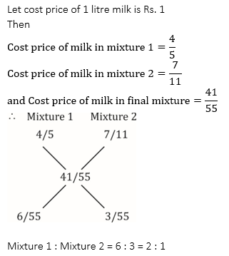 Q11. In a pot, the ratio of milk and water is 4 : 1. In another pot, the ratio of milk and water is 7 : 4. In what ratio mixture should be taken from both mixtures to make final mixture so that in final mixture the ratio of milk and water be 41 : 14?