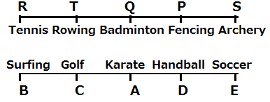 There are two boys sit between the one who likes Archery who sits at an extreme end and T. A sits middle of the row and not an immediate neighbour of B who does not like Soccer. E is sitting at an extreme end of the row. T likes Rowing and sits on the immediate right of the one who likes Badminton and faces the immediate neighhour of B. R does not sit at the extreme left end of the row. A does not likes Surfing. There is only one boy sits between Q and S who likes Archery. D likes Handball and is an immediate neighbour of the one likes who likes Soccer. D does not face the one who like Tennis. C likes Golf and is an immediate neighbour of the one who like Surfing. The one who likes Surfing faces the immediate neighbour of the one who likes Rowing. There are two boys between the one who likes Fencing and the one who likes Tennis. R does not like Fencing. E does not like Karate.