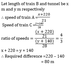Q15. Train-A crosses a stationary train B in 21 seconds and another Train-C crosses a tunnel in 28 seconds. If the length of the trains A and C be 220 m and 140 m respectively and ratio of their speeds be 4:3 then what is the difference between length of tunnel and length of train B?