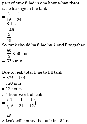 Q12.Two pipes can fill a cistern in 16 and 24 hours respectively. The pipes are opened simultaneously and it is found that due to leakage in the bottom of the cistern, it takes 144 minutes extra for the cistern to be filled up. When the cistern is full, in what time will the leak empty it ?