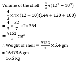 Q11. A hollow spherical shell is made of metal of density 5.4 g/cm³, If its internal and external radii are 10 cm and 12 cm respectively, find the weight of the shell (approximately)