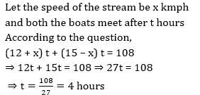 Q13. Two boats A and B start towards each other from two places, 108 km apart. Speeds of the boats A and B in still water are 12 kmph and 15 kmph respectively. If A proceeds downstream and B upstream, they will meet after.