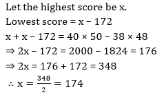 Q11. The batting average for 40 innings of a cricket player is 50 runs. His highest score exceeds his lowest score by 172 runs. If these two innings are excluded, the average of the remaining 38 innings is 48 runs. The highest score of the player is :