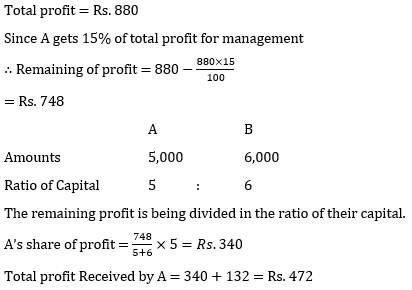 Q11. A is an Active partner and B is an inactive partner in business. A puts in Rs. 5,000 and B puts in Rs. 6,000. A received 15% of the profit for managing the business and the rest is divided in ratio of their invested capitals. The amount received by A out of the total profit of Rs. 880 ?