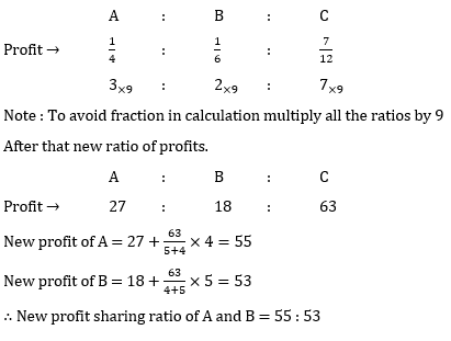Q13. A, B and C share profit in the ratio of 1/4 ∶1/6 ∶7/12. If C retires, A and B share the profit of C in the ratio of 4 : 5 respectively. The new profit sharing ratio of A and B will be ?