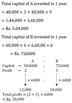 Q14. A and B enter into partnership investing Rs. 48,000 and Rs. 60,000 respectively. After 3 months, A withdraws Rs. 8,000 while B invests Rs. 6,000 after 6 months of starting of business. Out of the total amount of profit, if A gets Rs. 12,000 as his share at the end of the year,then find total profit share of A and B together?